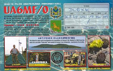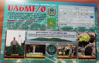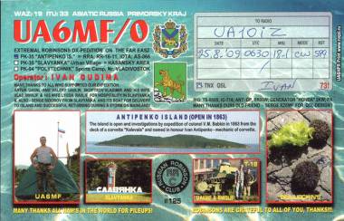 Характеристики острова: координаты – 42°49'53.06", 131°26'50.51" ; площадь 1409573 кв.м, QTH-локаторы – PN52ru, PN52rt, RDA – PK-35, референция RR-16-11. Проведено более 200 QSO, журнал экспедиции не сохранился. Отчет об экспедиции на остров Антипенко опубликован на ???
