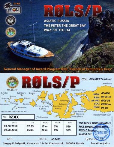 Показания GPS-приемника, вид на острова с моря, используемая типовая QSL: