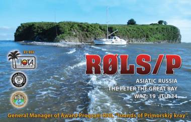 Для экспедиции использовалась типовая QSL (с фотографией острова Речной), далее вид на остров с косы и команда на отходе:
