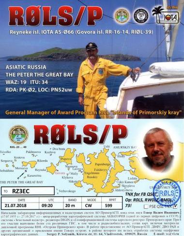 Характеристики острова: координаты 42°55'18.16", 131°44'48.80", площадь 65899 кв.м., QTH-локатор – PN52uw, RDA – PK-02, референция RR-16-14 (ранее активизирована). Работа велась с 06:03 (UTC) 21.07.2018г. по 03:16 22.07.2018г., проведено 365 QSO, файл рабочего журналов выложены на HAMLOG.RU и подключены к RRA и RRC Activity 25. Отчет по экспедиции опубликован на сайте РО СРР Приморского края: http://r0l-srr.ru/topic/66-ekspeditcii/page-7 (# 135).