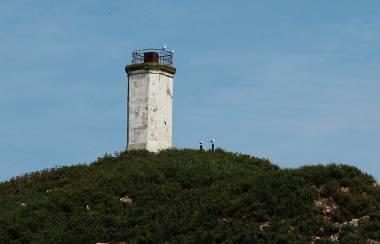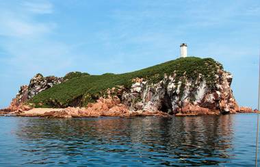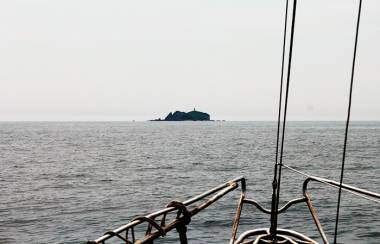 Остров на подходе, остров со стороны Попова, остров с моря, Маяк на острове, "Пепелай" на высадке: