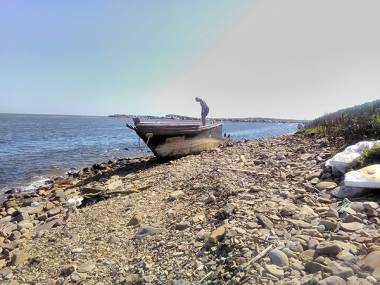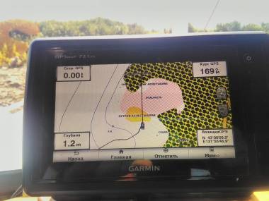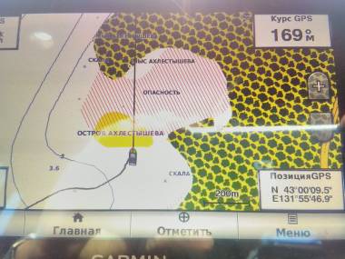 Показания GPS-приемника, карта, виды с места стояники, обратная сторона острова, пепелац: